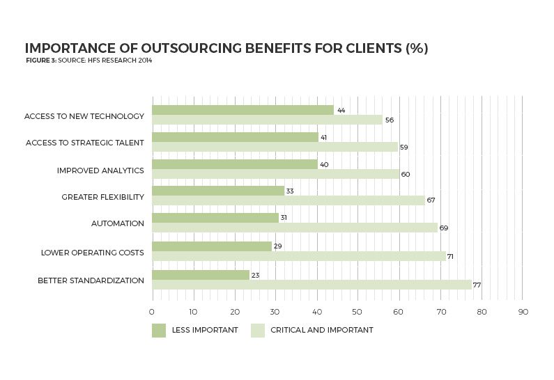 The technological advances have caused a shift in demand changing client expectations and the way services are delivered. Outsourcing is no longer only about cost reduction, although still major driver, there has been an increasing demand for standardization, digitization, automation and improved analytics (Figure 3).